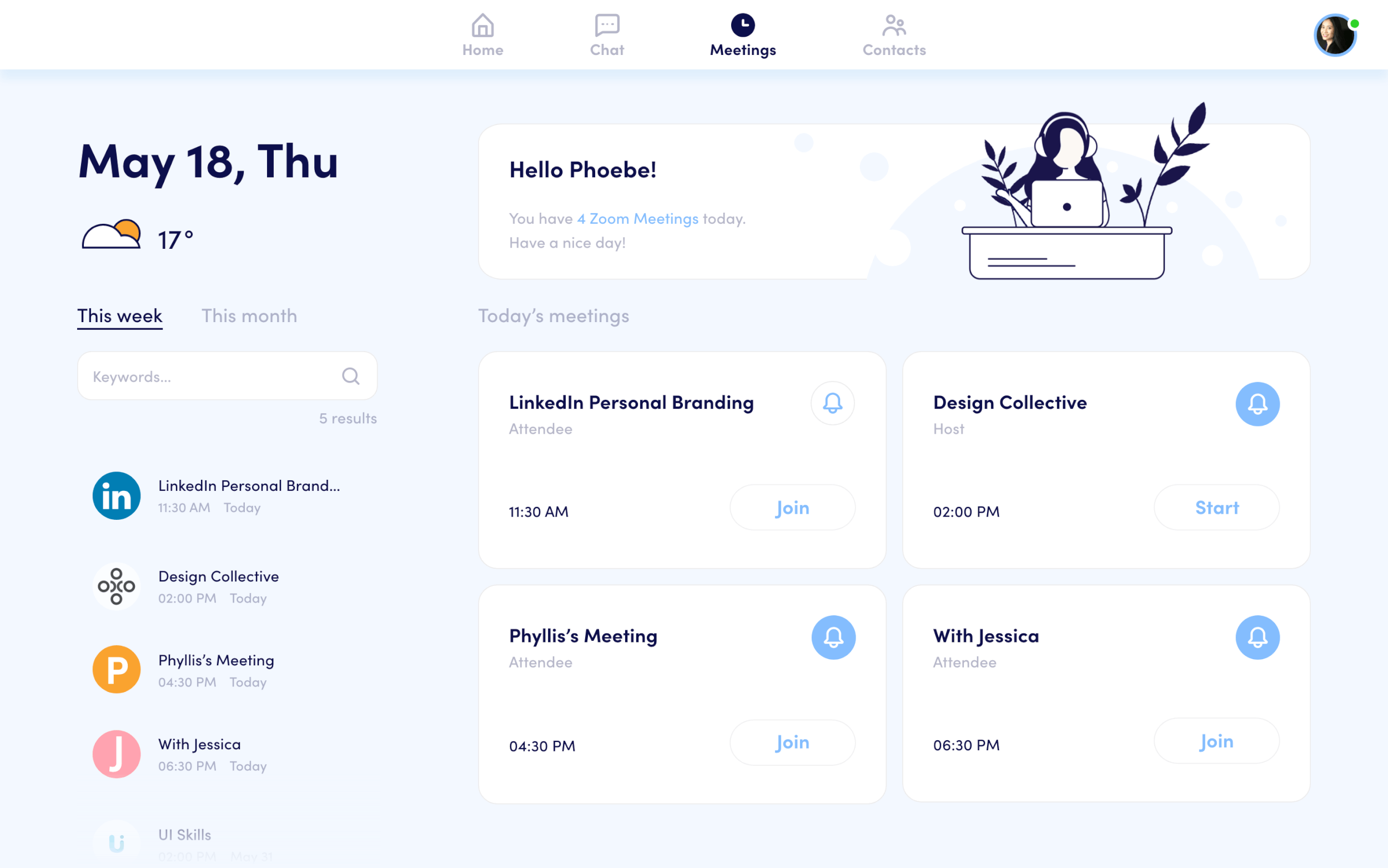 As an active user of Zoom, I would like a relaxing Zoom Meeting interface, which informs me of the meetings concisely. So I took the challenge to redesign it by making use of expandable cards and illustrations.